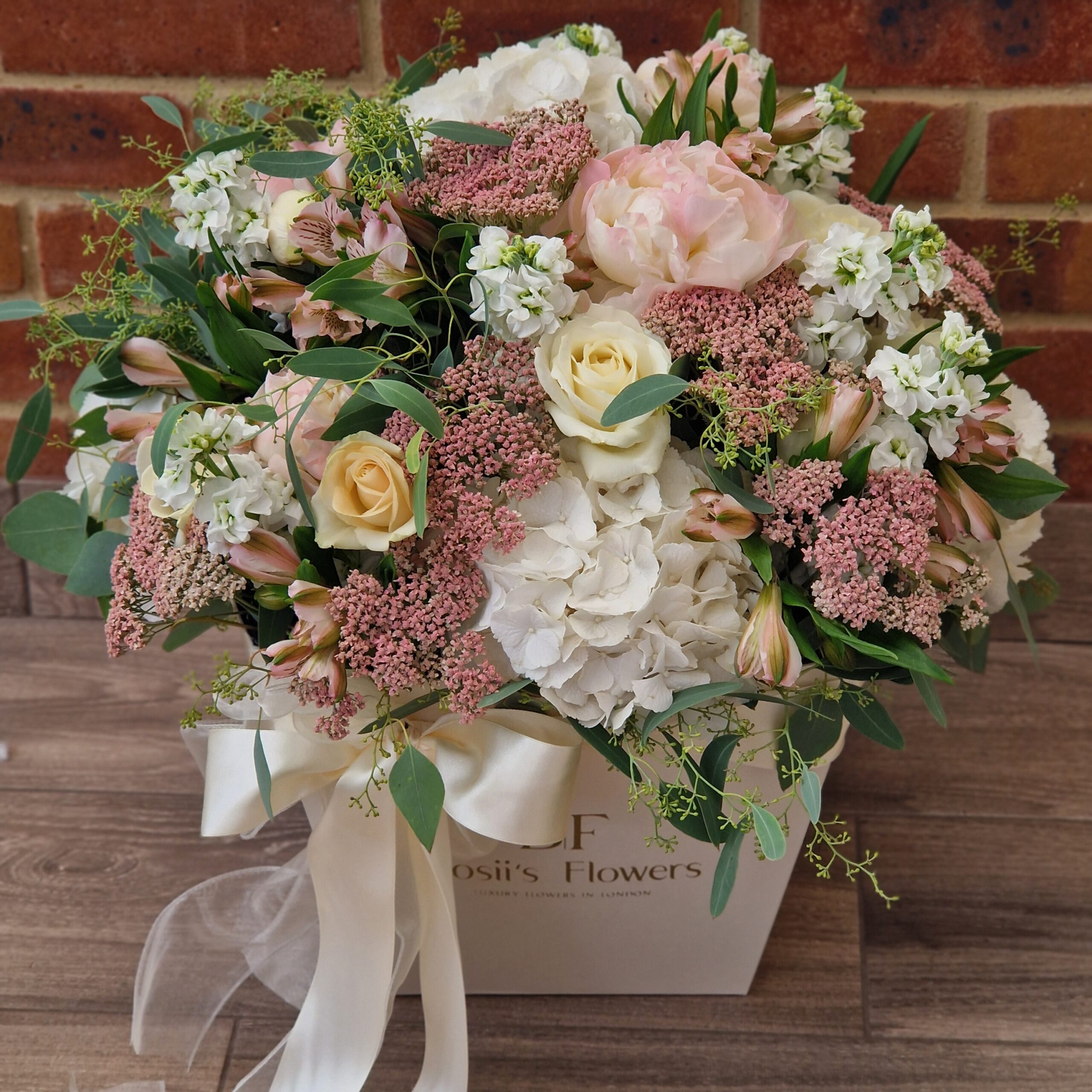 Graceful. Serene. Timeless. The White Elegance in Hat Box is a statement of understated luxury, handcrafted by Bosii’s Flower for those who appreciate pure, refined beauty. This stunning arrangement is presented in our signature designer hat box, offering a perfect blend of classic sophistication and modern style.
